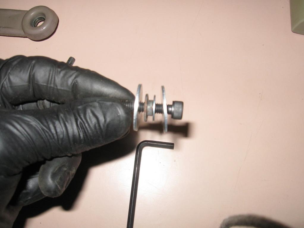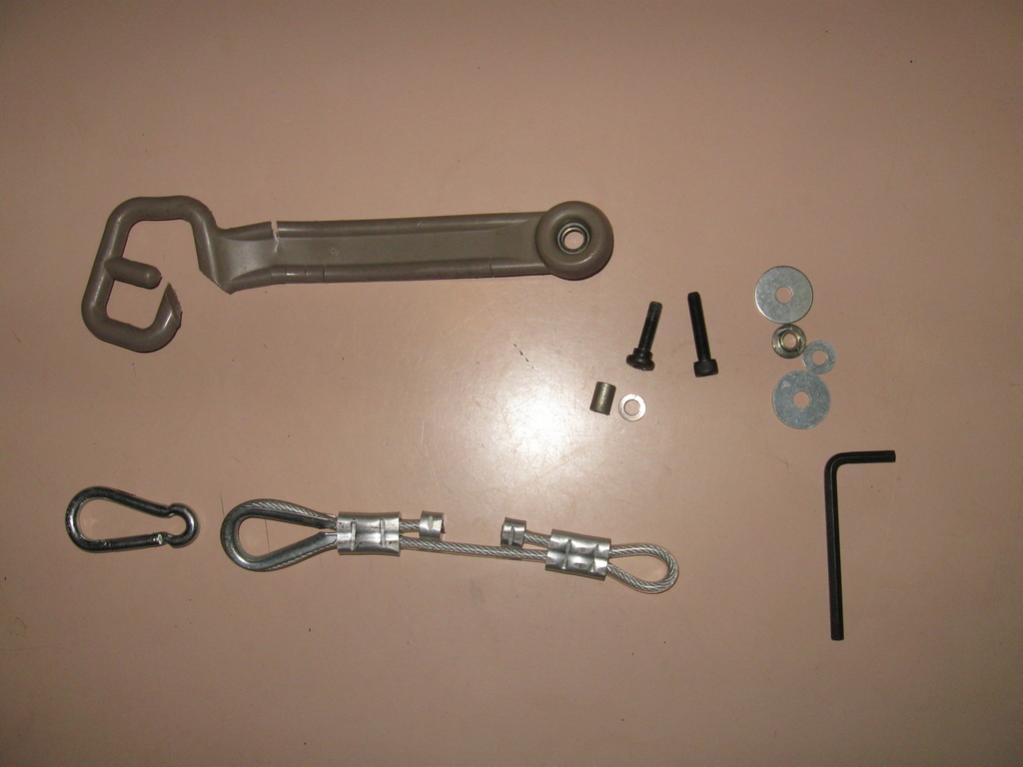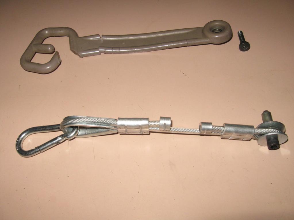 Again, thanks to the post that Tim provided above for the inspiration. In case it's useful my version is shown in the pictures below. The whole cost was less than ten dollars and took an hour. The cable is 3/16" vinyl-coated steel cable, with a 3/16" thimble on the bottom, and a stack of big/small/small/big washers on a slightly longer bolt than the original. In high load cable assemblies you should not use those aluminum ferrules on plastic-coated cable, but for this application they grip well enough for me.