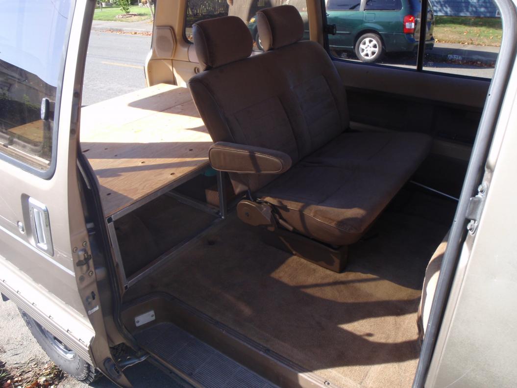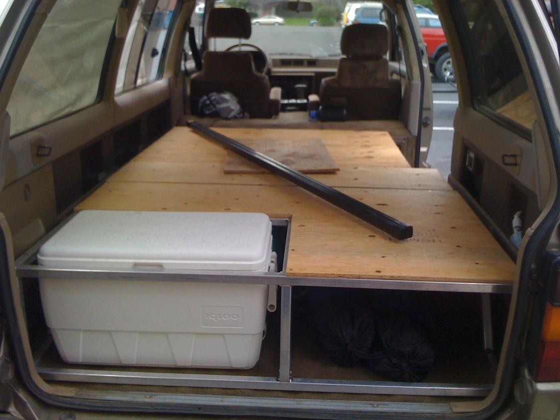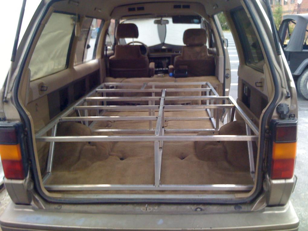 Here’s a platform I made for the inside of my 1987 Toyota 4wd Van. Obviously dimensions can be altered to suit your needs. I have made multiple platforms for various vehicles I’ve owned over the years, but wanted this one to be better than most of the wood ones I’ve made. I decided on MIG welding a frame of 1”x1”x0.125” aluminum tubing (due to the strength and lightweight of this versus a wood platform) and covering it with 1/2" plywood. I had some D grade plywood lying around, so used that at first, but will be replacing it with Birch or similar hardwood plywood soon. I designed the platform in two pieces, with one coming out the slider and one coming out the back. The rear piece can stay in while the middle bench is being used, but does not allow the middle bench to be reclined flat into sleep/bed mode. I made a mockup of the platform allowing the middle bench to be used in this way, but the overall platform was not as stable and I preferred for this platform to be as stable as possible. I will be building an additional rear platform that will allow me to use the middle bench in sleep mode. OD dimensions of the Rear Platform are 52” wide X 46” long X 14” tall and OD dimensions for the Front Platform are 48” wide X 35” long X 14” high. The front 12” of the rear platform is one long hatch to aid in access, the front platform can be slid out to access the batteries, and I have the pieces to cover the openings when using only one cooler. I will be using the Deluxe Barrel Catch (P/N 01103 for 6 pack) to hold down the hatches, with small holes drilled to get a finger in and lift them up. For now I’m using 2 Thermarest DreamTime XL pads (77”x30”x3.5”), but will be replacing them with a custom Western Road Sleeper mattress (80”x50”x5”). I designed the platform at this height to try and maximize headroom with the 5” mattress, while still allowing good storage underneath with Medium sized Rubbermaid tubs, Action Packers, and milk crates. I also spaced out two spots so I could drop in 1 or 2 of my 65qt coolers,,, since the coolers are 14.5” tall, they needed to be dropped in, but the mattress makes the 1/2” difference unnoticeable, and they are basically locked in and do not move at all (which is key while tailgating or day trips, when cooler is loaded but not much else is packed around it). I could’ve made the platform about 2” taller and the coolers could’ve slid in, but decided to go the route I did after weighing pros (sliding in a full cooler is easier, flush top height, draining cooler w/o removing it) and cons (seated height, cooler stability as noted above, ease of opening). Next step will be to replace my carpet with vinyl, to save my good carpet and ease cleanup. I’m sure I’m forgetting some key points,,, but let’s get on with the pictures.