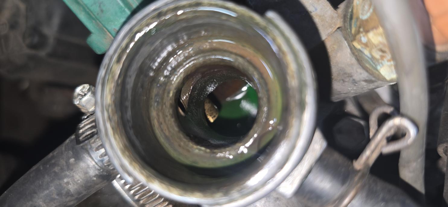 Llamavan's comments about the radiator overflow hose got me thinkin'. I cut/pulled it off. The little metal overflow tube coming out of the filler neck is totally corroded. I pushed a nail thru the metal tube to clear it and make sure that it's free to flow. I had the new rubber hose on hand so I cleaned up the tube as best I could, put some grease on it, put the new hose on and hose clamped it. This is temporary until I get a new filler neck. The old overflow hose had a bunch of rusty corroded gunk in it and no doubt it was restricting the flow of coolant. Hopefully the fillernecks are still available.