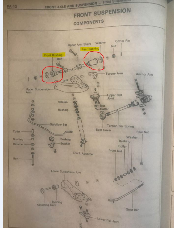 So I'm thinking to get only the bushings and replace them. Do I need 4 front Upper bushings #88912549 2 for each side? I'm looking the manual's pic below, are the Front and the Rear Bushing the same part?