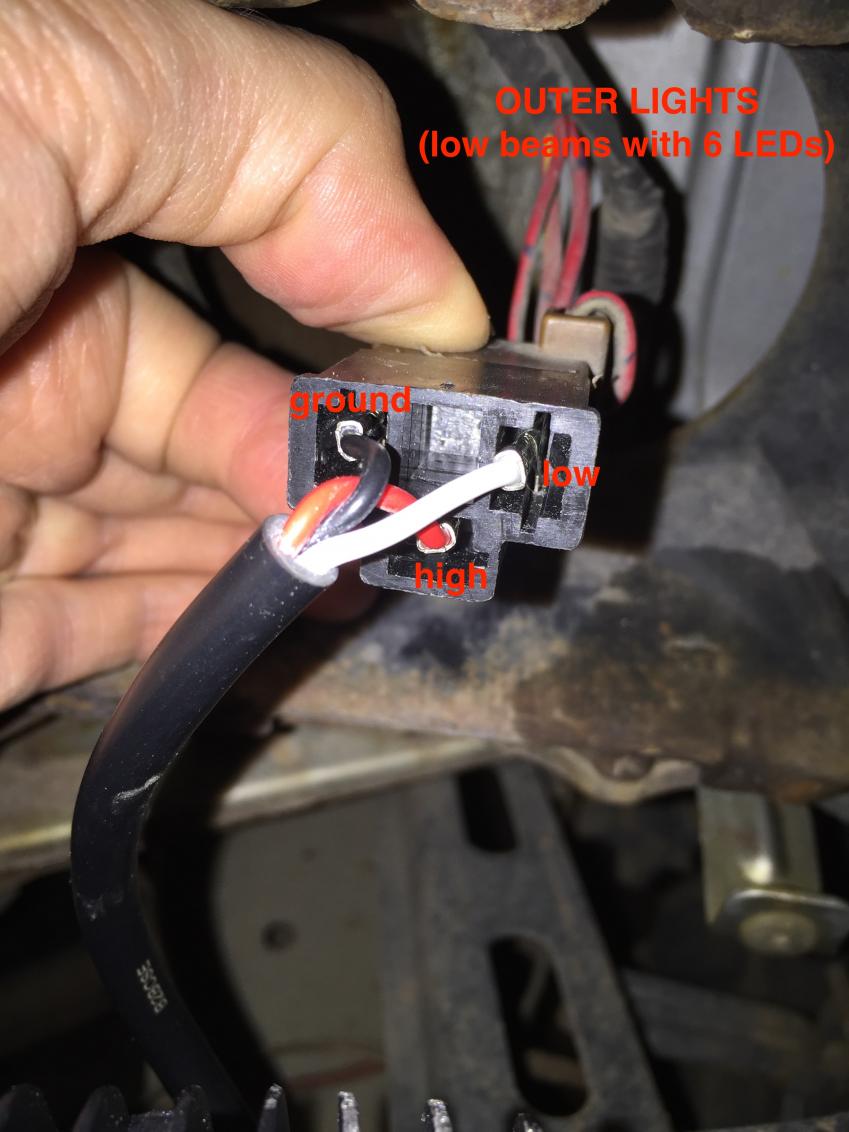 Anyway, installed these new LED headlights I got off amazon, when i turn the switch to the headlight position the low beams dont come on, but when i turn it to high beam all 4 lights will turn on and the blue high beam dash indicator turns on and off properly. everything seems to be working perfectly except the absence of low beams. I took some photos of the harness and will attach those below. there are 3 pins, "drive", "pass", and "ground", see the pictures for which wires are running into which.