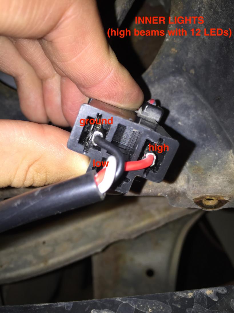 side note: on these new bulbs the high beam is a red wire, low beam is white, ground is black. how the low/hi beam works on these is 6 LED's are on for lo-beam and all 15 are on for hi-beam. i think I've got them wired correctly.... i could be wrong however, ha ha