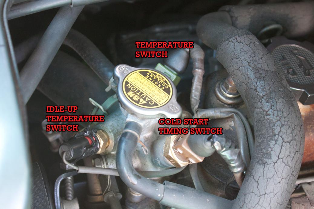 RE: code 4. Which sensor did you replace? The gauge and the computer use different sensors. The gauge uses a single wire sensor threaded into the cylinder head just above the distributor. The computer uses one threaded into the upper water outlet. Here's an image from another thread to help with the location. It's the one marked "temperature switch".