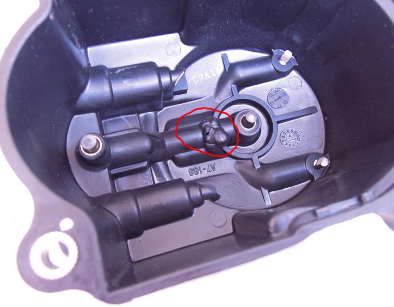 Here is my melted distributor cap. This might be due to moisture on the rotor, causing it to arch around the plastic