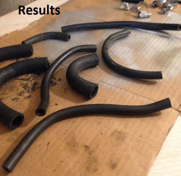 In the process of engine reassembly I didn't feel like hunting down a bunch of discontinued hoses or paying 15 bucks or more for a simple bend in a hose, so I took the wingnut route and tried my hand at some DIY hose molding.