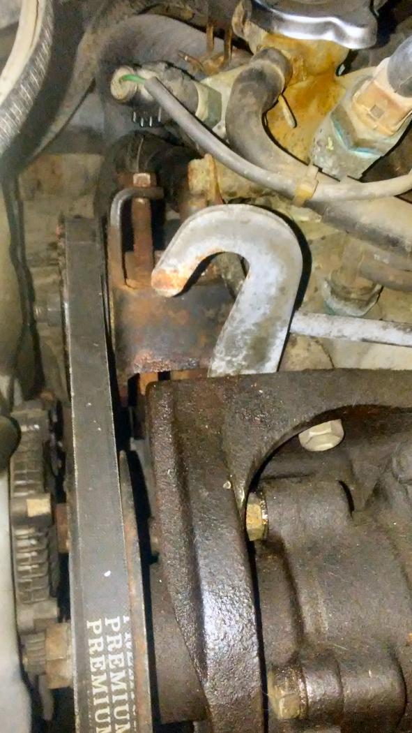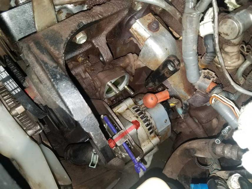 Note: the photo shows a nut on the back of the alternator, that should not be there. it becomes inaccessible when the water hose is in place. Whoever put that on there is asking for trouble later. Its a solution when your missing the blue wing-nut-bolt and a slightly longer bolt won't hold on its own (as was mine when I first got it).