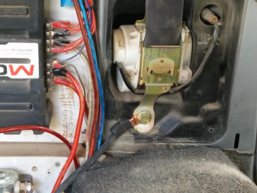 So the better way, for me, was to wire both the amps to the marine battery negative. Then find a solid ground for the marine negative. Tim, you can hate me later for the ground I've used. It was the shortest route. You guessed it. The seat belt holder.