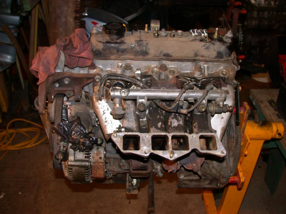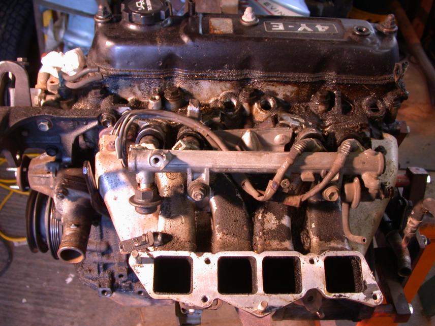 Here's the transplant 4y with the manifolds bolted (and torqued!), tons of carbon removed and ready for Toyota to call me with that parts order! *note the "clipped" wires to #3 & 4... ugghh.