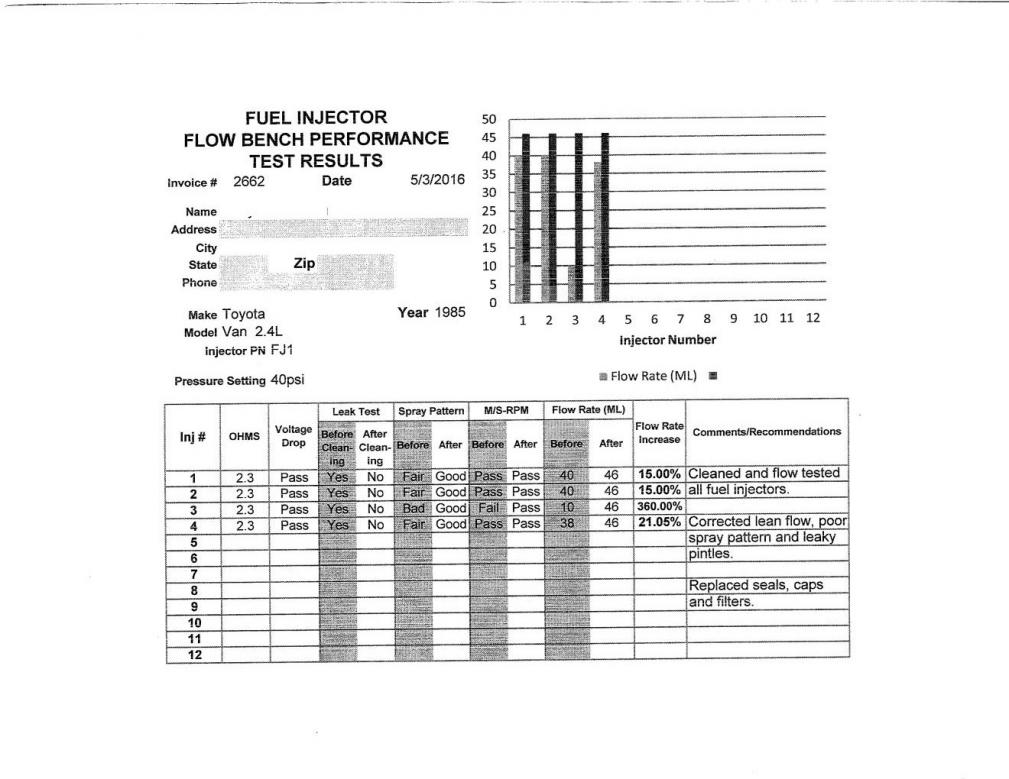 I just got my fuel injectors back from Dr. Injector and I'm pretty excited with the results. One of the fuel injectors (injector for cylinder 2) failed the spray pattern test, failed the mL/second test, and had a flow rate of 10mL. The other had a flow rate of about 40mL!!! After cleaning them, I had a 360% increase in flow rate in the one injector. That was the issue. Very little fuel to cylinder 2. :dance2:I attached the results to this post, in case anyone wants to see.