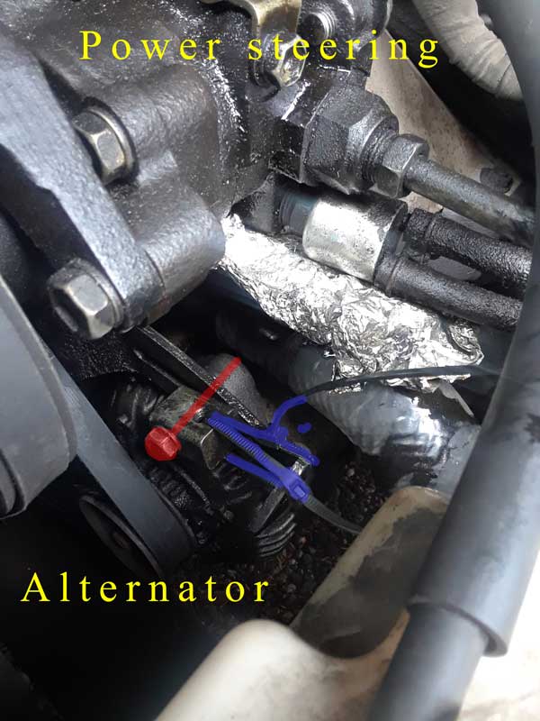 Here's how I fixed mine. I first got a longer red bolt because the alternator was stripped from the previous owner. It eventually stripped out the remaining threads from slipping and needing readjustment. Rather than take the radiator hose off and put a longer red bolt with a nut on the end I chose to use zip ties temporarily (I didn't know the blue wing-nut-bolt existed.). I highlighted the zip ties in blue as it replaces the wing-nut-bolt.