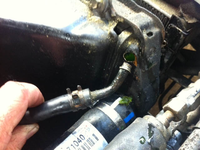 The thing that kept me from driving it thought was this. As I was putting the coolant in I heard a trickle and found this. I remembered when I put the hose on the radiator felt a little soft. Am I looking at a new radiator or can I get this repaired successfully? :pissed: Shoot!