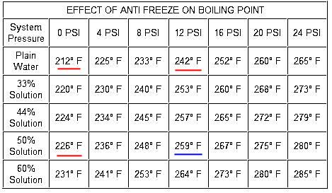 Some facts to consider: @ 0 psi (no cap) a 50/50 antifreeze/water mix boils @ 226° F. @ 13 psi, it will boil @ 261° F. @ 19 psi, it will boil @273° F.