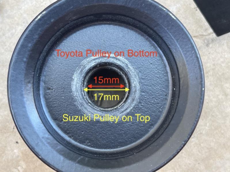 Where I ran into problems is the pulley. The "Suzuki" alternator has a 17mm shaft, but the "Toyota" alternator has a 15mm shaft, which means you can't put the Toyota pulley on the Suzuki alternator. I'll have to look at the pulleys again to see if a 3 rib belt would line up correctly and run straight.