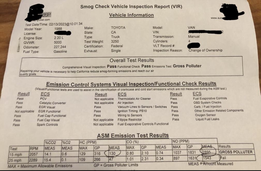 Hello All, I recently moved back to California from Oregon and needed to get my 1988 5spd 4x4 California Emissions Van smoged. It failed:no:. Below are the test results.