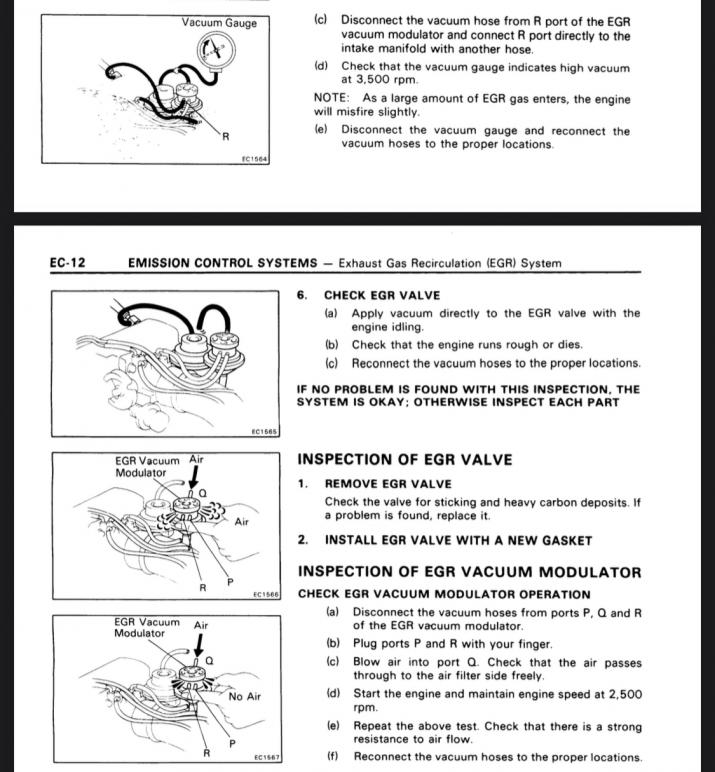 The van runs good (average 21 mpg) but not perfect, it feels like it has a slight miss at idle (~900 rpm). If I try to lower the RPM to 800 with the idle adjust screw it runs rough (shakes). My thought is it has to do with the EGR system by looking at the service manual and way it failed smog and the symptoms it is having. I am trying to diagnose what part needs servicing. Reading the steps to check the EGR system I am a little hung up on the below set.