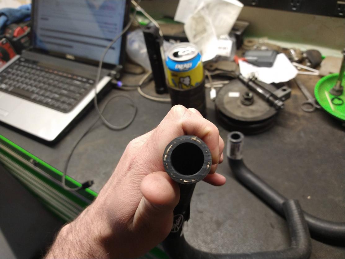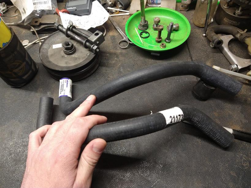 I tried to get the respective part numbers visible on both but, without getting into exact measurements, the ID on these hoses is smaller than my thumb, and I've been frequently ridiculed my whole life for having slender fingers and thumbs.