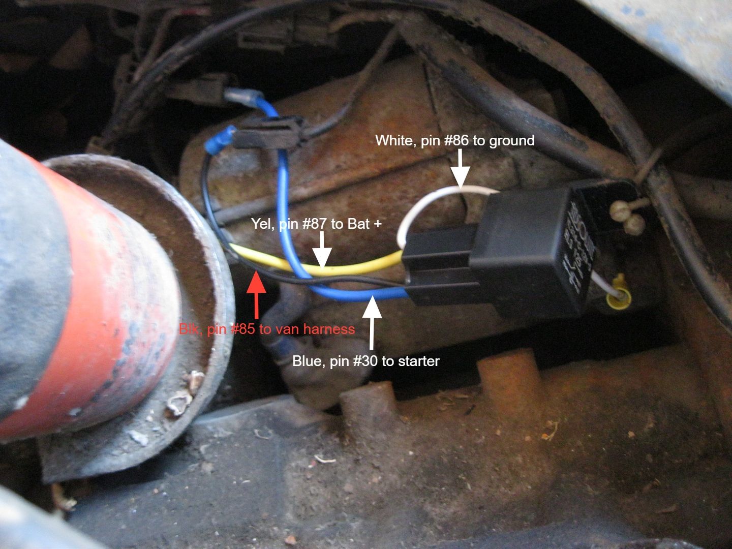 I had a spare relay lying around and wired it in on my lunch break, fired right up. At this point I am so tired of playing with it I am just happy to be able to start my van so I can move it before street cleaning happens in a few days...