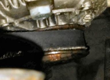 (wet oil spots underneath dry flaking rust)