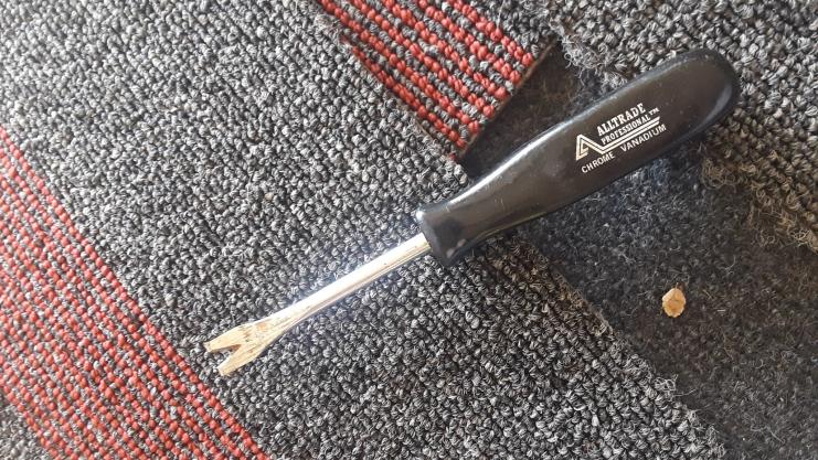 Using your trim tool remover or a flathead screwdriver, gently wedge it underneath a clip and SLIGHTLY bend it away from the door panel, emphasis on gently and slightly. Do NOT use pliers to bend it more than necessary, as you will probably snap it. To make removing a panel easier, only remove the top and side clips, as the panel will then fall down and out of its slot, no removal of the bottom clips neccessary. i reattached a top clip for demonstration, heres what it looks like removing it: