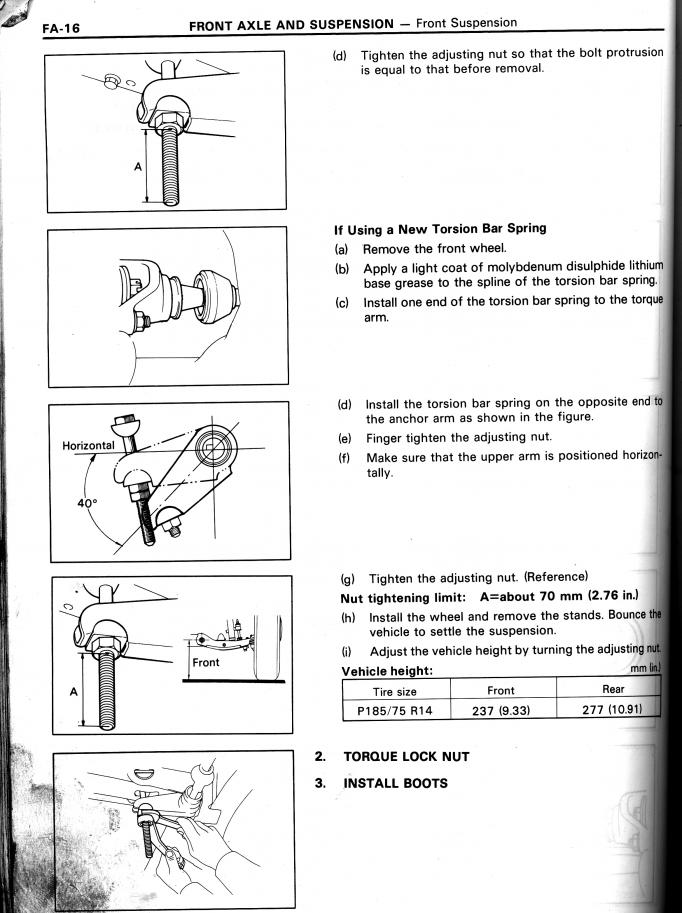 I agree the book is a little vague here. In reading yours I don't think they are talking about the a-arm. I think they're talking about the anchor arm. When they say horizontal, I don't think they mean exactly. I think they are saying somewhere in the range as shown in the figure (as to allow the nut to be started on the bolt). Out of curiosity I checked in my 89 manual and see they've omitted the statement "(f) Make sure the upper arm is positioned horizontally". They replaced it with "(e) install the anchor arm to the torsion bar as shown in the illustration (f) Finger tighten the adjusting nut and measure the bolt end protrusion. Bolt end protrusion: About 40 mm (1.57 in.) If bolt end protrusion is not as specified, reinstall the anchor arm in the correct angle.